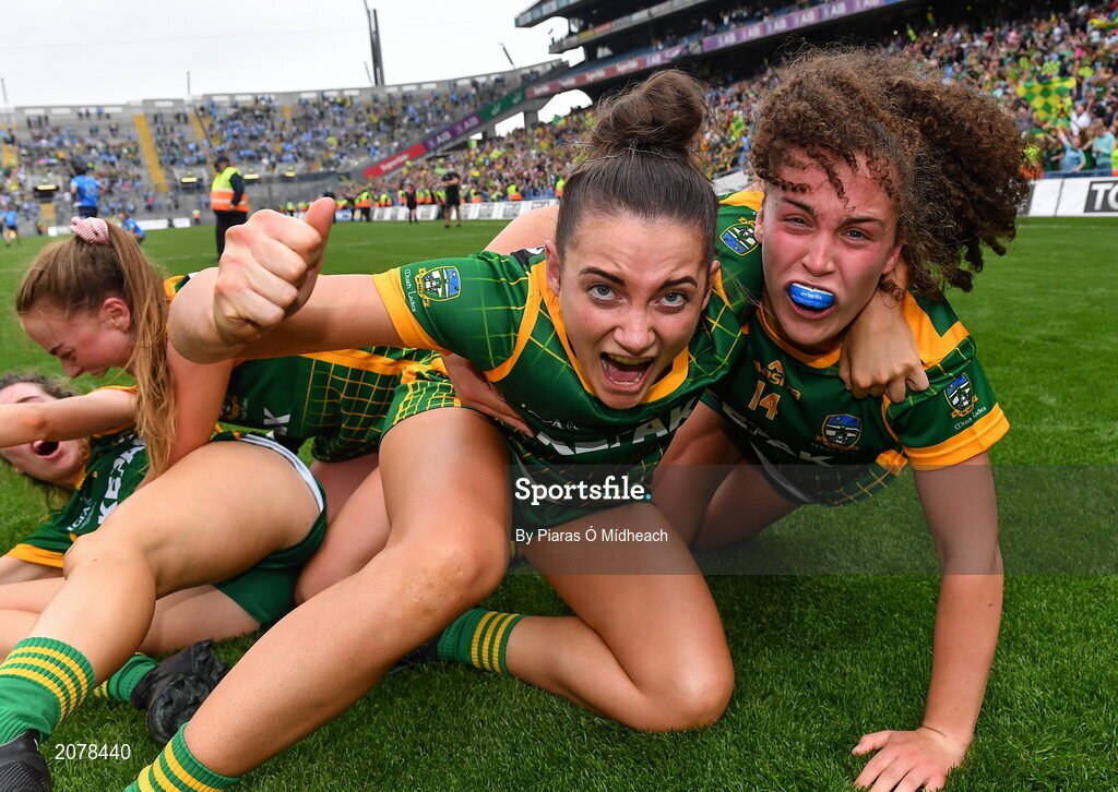 5 September 2021; Meath players Máire O'Shaughnessy, left, and Emma Duggan celebrate after their side's victory in the TG4 All-Ireland Ladies Senior Football Championship Final match between Dublin and Meath at Croke Park in Dublin. Photo by Piaras Ó Mídheach/Sportsfile