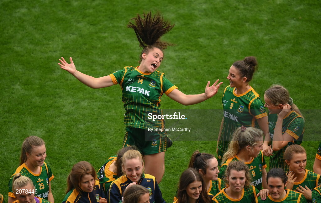 5 September 2021; Emma Duggan and Meath team-mates celebrate following the TG4 All-Ireland Ladies Senior Football Championship Final match between Dublin and Meath at Croke Park in Dublin. Photo by Stephen McCarthy/Sportsfile