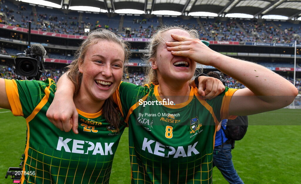 5 September 2021; Meath players Ali Sherlock, left, and Orlagh Lally celebrate after their side's victory in the TG4 All-Ireland Ladies Senior Football Championship Final match between Dublin and Meath at Croke Park in Dublin. Photo by Piaras Ó Mídheach/Sportsfile