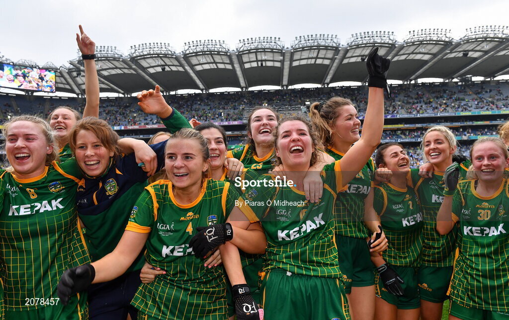 5 September 2021; Meath players, including Katie Newe, 4, and Orla Byrne, 10, celebrate their side's victory in the TG4 All-Ireland Ladies Senior Football Championship Final match between Dublin and Meath at Croke Park in Dublin. Photo by Piaras Ó Mídheach/Sportsfile
