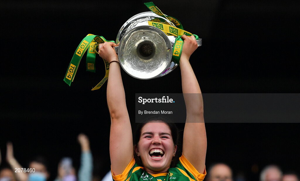 5 September 2021; Meath captain Shauna Ennis lifts the Brendan Martin Cup after after the TG4 All-Ireland Ladies Senior Football Championship Final match between Dublin and Meath at Croke Park in Dublin. Photo by Brendan Moran/Sportsfile