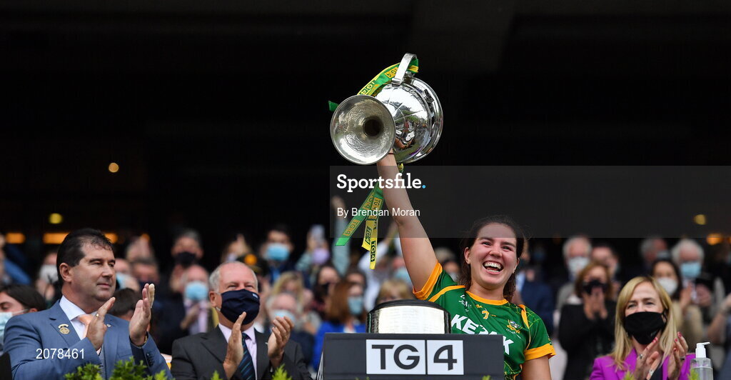 5 September 2021; Meath captain Shauna Ennis lifts the Brendan Martin Cup after after the TG4 All-Ireland Ladies Senior Football Championship Final match between Dublin and Meath at Croke Park in Dublin. Photo by Brendan Moran/Sportsfile