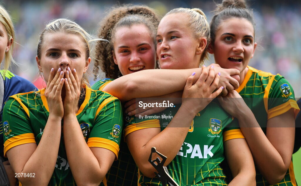 5 September 2021; Meath players, from left, Katie Newe, Emma Duggan, Vikki Wall and Máire O'Shaughnessy celebrate after the TG4 All-Ireland Ladies Senior Football Championship Final match between Dublin and Meath at Croke Park in Dublin. Photo by Brendan Moran/Sportsfile