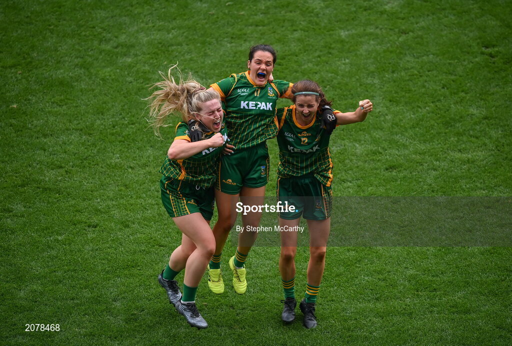 5 September 2021; Meath players, from left, Orlagh Lally, Niamh Gallogly and Niamh O'Sullivan celebrate following the TG4 All-Ireland Ladies Senior Football Championship Final match between Dublin and Meath at Croke Park in Dublin. Photo by Stephen McCarthy/Sportsfile