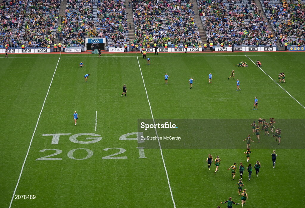 5 September 2021; Meath players celebrate as Dublin players come to terms with their defeat following the final whistle of the TG4 All-Ireland Ladies Senior Football Championship Final match between Dublin and Meath at Croke Park in Dublin. Photo by Stephen McCarthy/Sportsfile