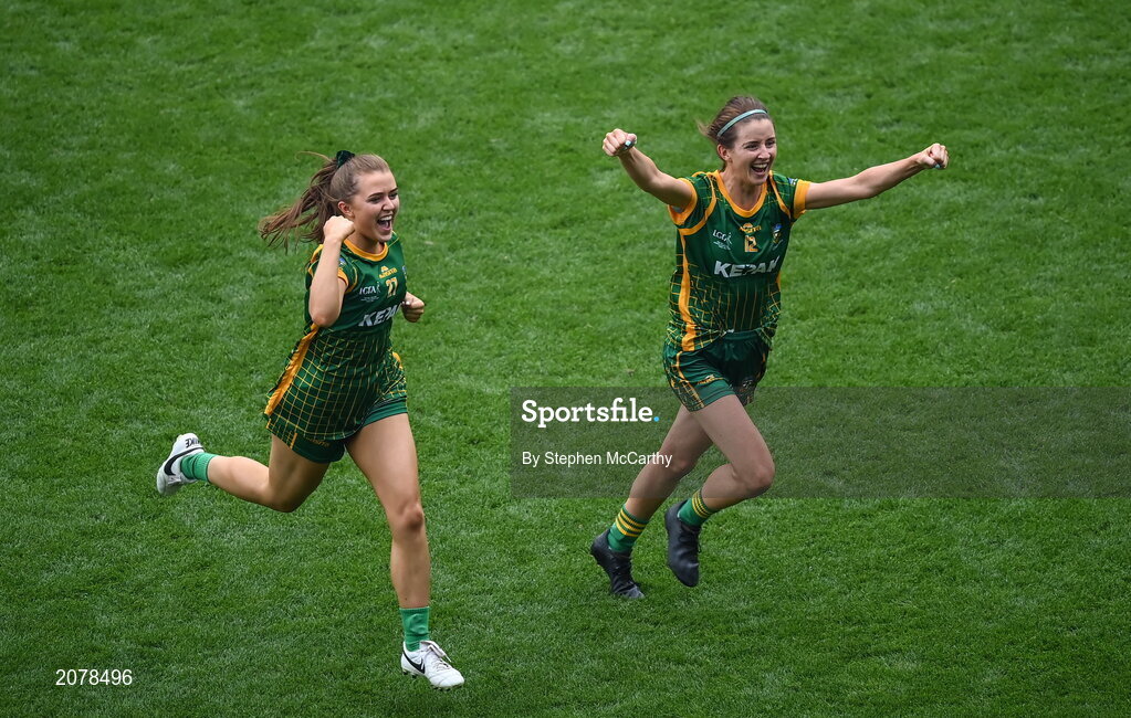 5 September 2021; Ailbhe Leahy, left, and Niamh O'Sullivan of Meath celebrate following the TG4 All-Ireland Ladies Senior Football Championship Final match between Dublin and Meath at Croke Park in Dublin. Photo by Stephen McCarthy/Sportsfile
