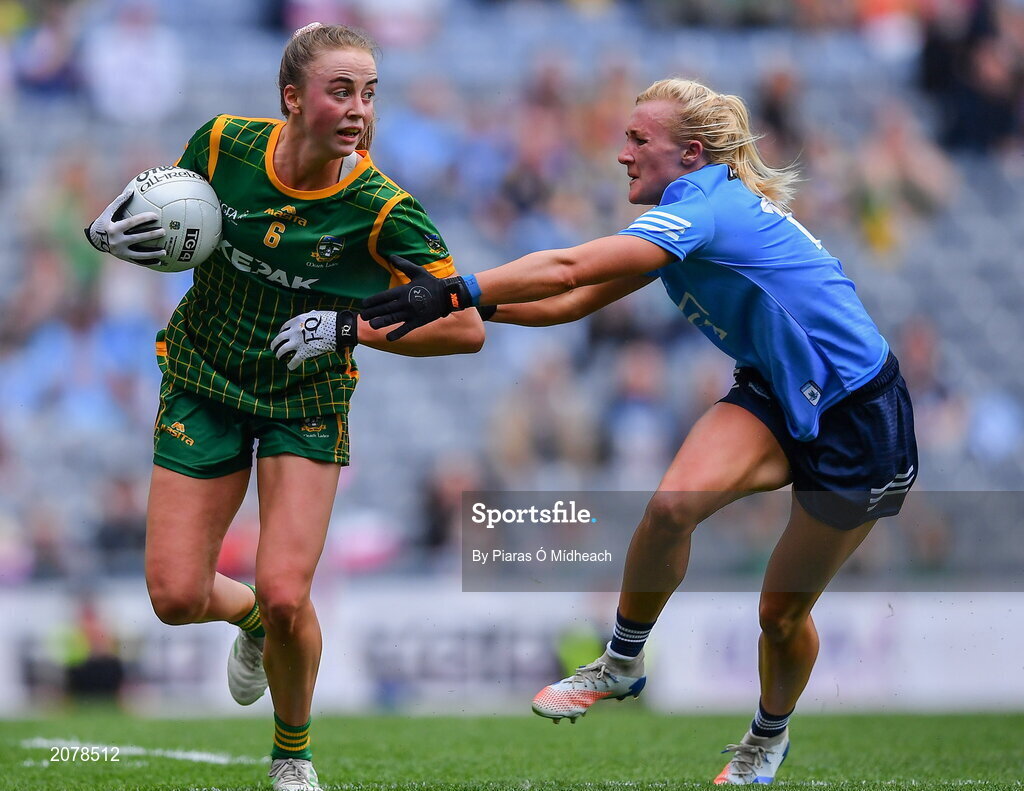 5 September 2021; Aoibhín Cleary of Meath in action against Carla Rowe of Dublin during the TG4 All-Ireland Ladies Senior Football Championship Final match between Dublin and Meath at Croke Park in Dublin. Photo by Piaras Ó Mídheach/Sportsfile