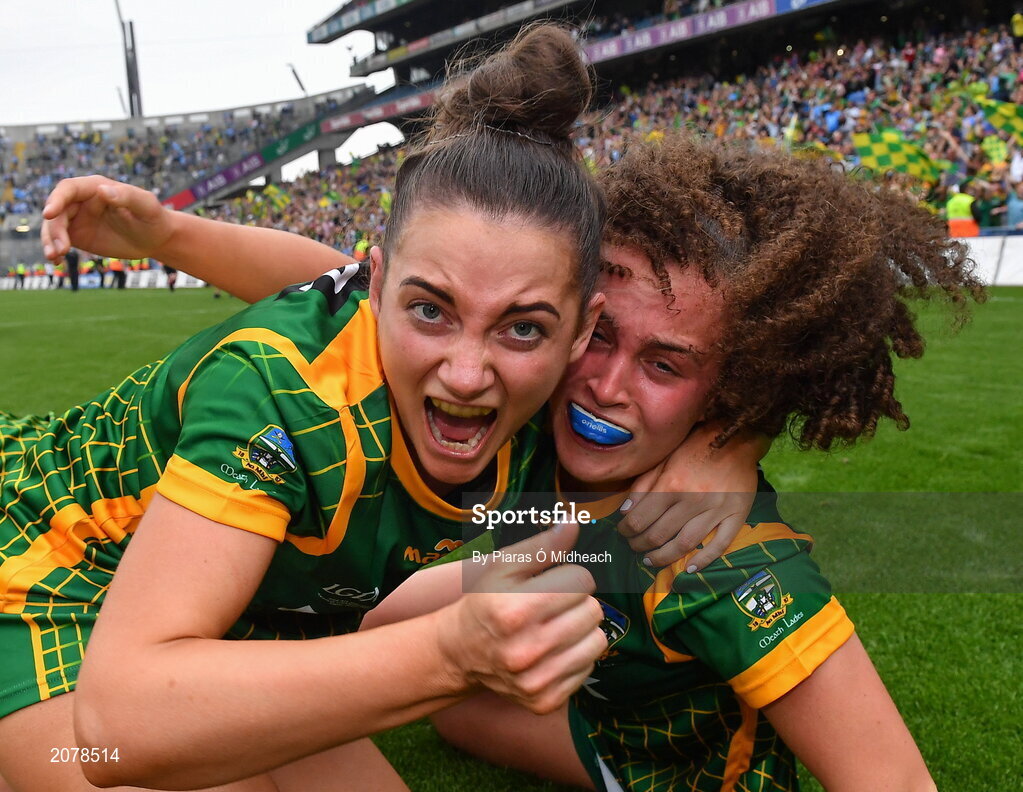 5 September 2021; Meath players Máire O'Shaughnessy, left, and Emma Duggan celebrate after their side's victory in the TG4 All-Ireland Ladies Senior Football Championship Final match between Dublin and Meath at Croke Park in Dublin. Photo by Piaras Ó Mídheach/Sportsfile