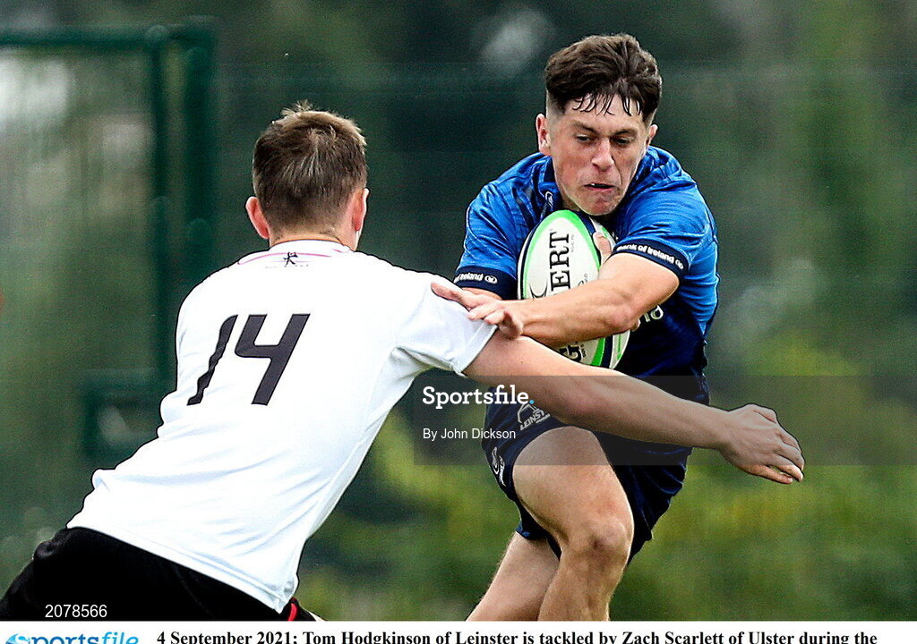 4 September 2021; Tom Hodgkinson of Leinster is tackled by Zach Scarlett of Ulster during the IRFU U18 Men's Clubs Interprovincial Championship Round 3 match between Ulster and Leinster at Newforge in Belfast. Photo by John Dickson/Sportsfile