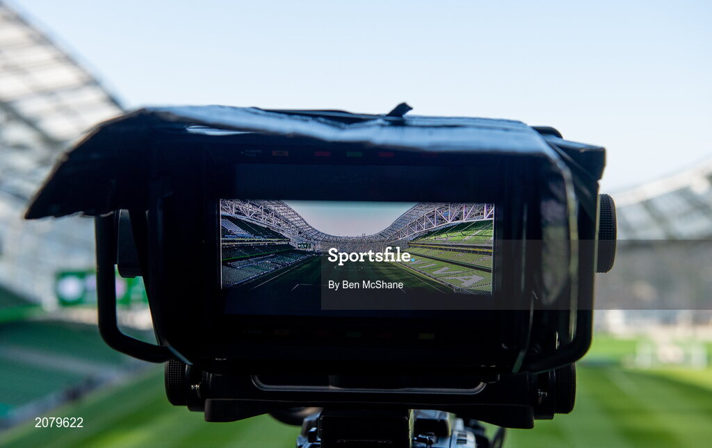 7 September 2021; A general view of the Aviva Stadium in Dublin seen through a broadcasting camera before the FIFA World Cup 2022 qualifying group A match between Republic of Ireland and Serbia. Photo by Ben McShane/Sportsfile