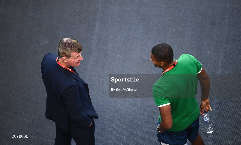 7 September 2021; Republic of Ireland manager Stephen Kenny and goalkeeper Gavin Bazunu before the FIFA World Cup 2022 qualifying group A match between Republic of Ireland and Serbia at the Aviva Stadium in Dublin. Photo by Ben McShane/Sportsfile