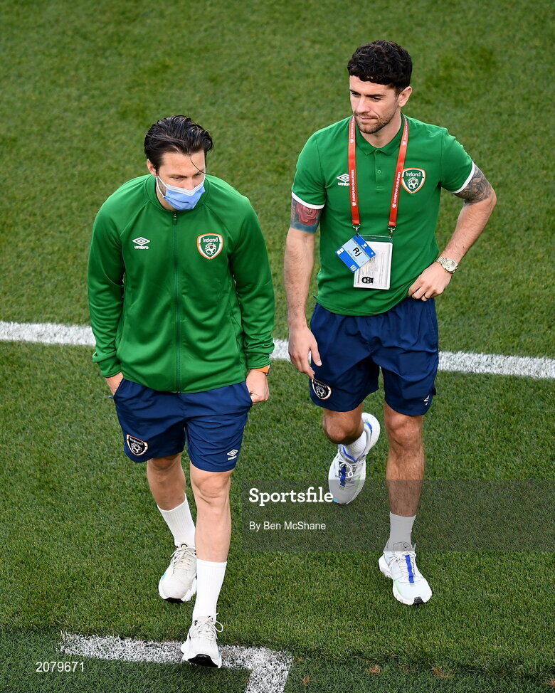 7 September 2021; Harry Arter, left, and Robbie Brady of Republic of Ireland before the FIFA World Cup 2022 qualifying group A match between Republic of Ireland and Serbia at the Aviva Stadium in Dublin. Photo by Ben McShane/Sportsfile