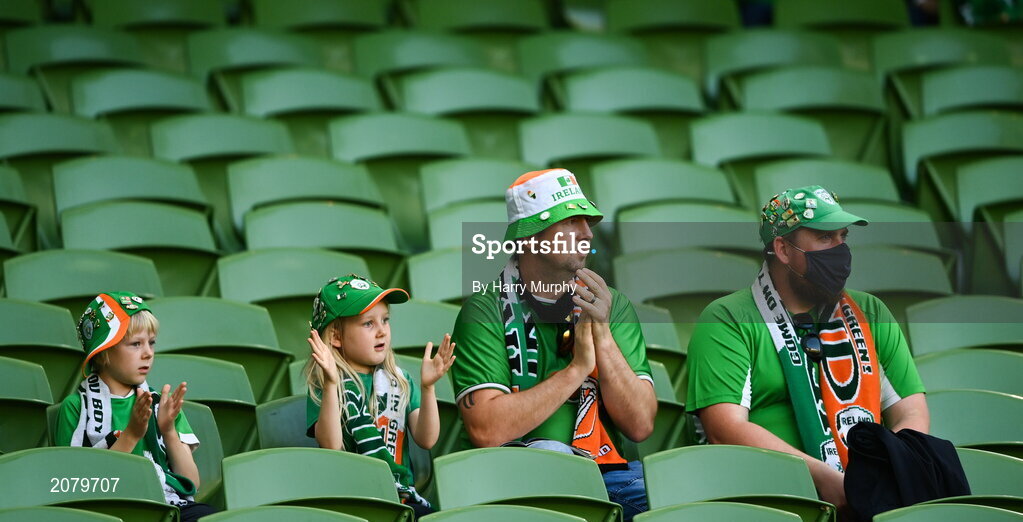 7 September 2021; Republic of Ireland supporters before the FIFA World Cup 2022 qualifying group A match between Republic of Ireland and Serbia at the Aviva Stadium in Dublin. Photo by Harry Murphy/Sportsfile