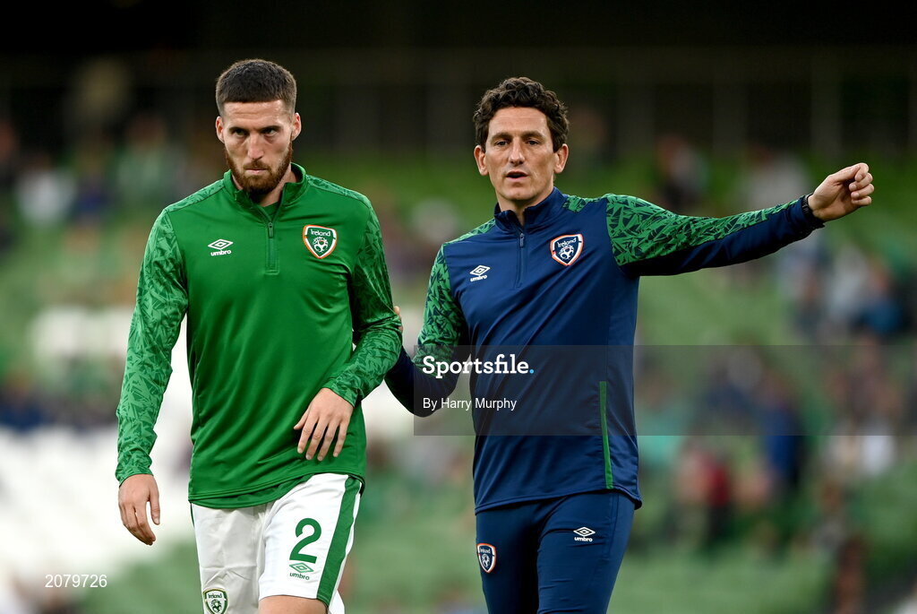 7 September 2021; Matt Doherty of Republic of Ireland with coach Keith Andrews before the FIFA World Cup 2022 qualifying group A match between Republic of Ireland and Serbia at the Aviva Stadium in Dublin. Photo by Harry Murphy/Sportsfile