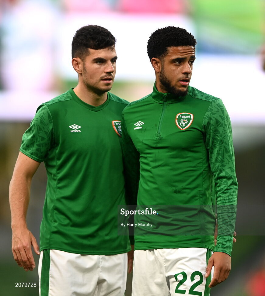 7 September 2021; John Egan and Andrew Omobamidele of Republic of Ireland before the FIFA World Cup 2022 qualifying group A match between Republic of Ireland and Serbia at the Aviva Stadium in Dublin. Photo by Harry Murphy/Sportsfile