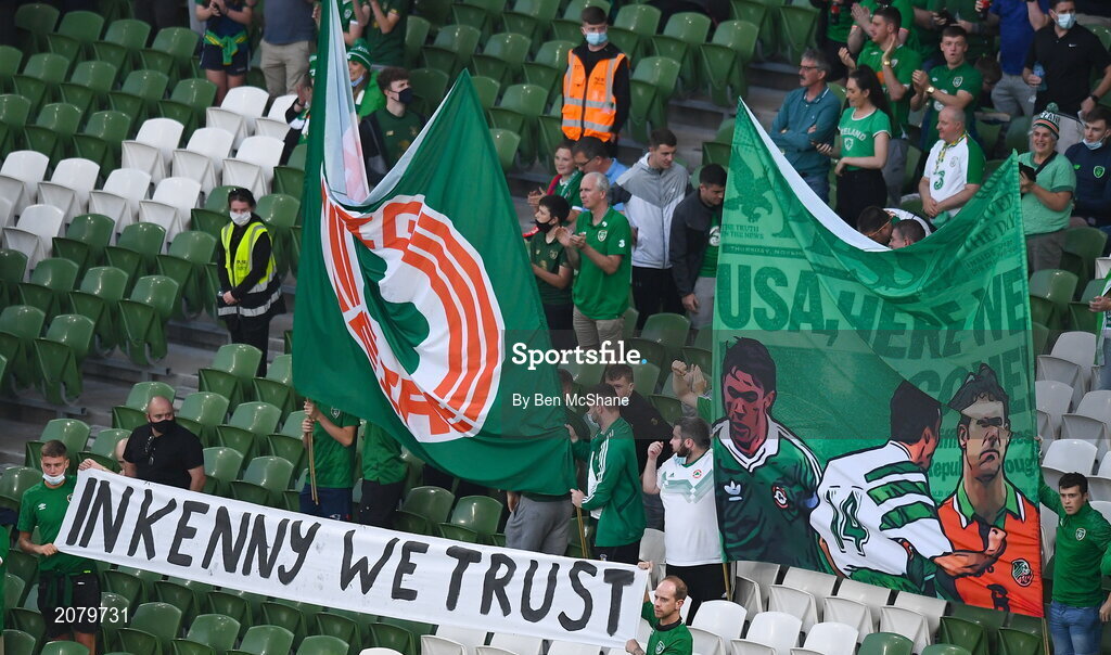 7 September 2021; Republic of Ireland supporters before the FIFA World Cup 2022 qualifying group A match between Republic of Ireland and Serbia at the Aviva Stadium in Dublin. Photo by Ben McShane/Sportsfile