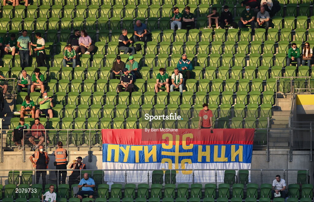 7 September 2021; A Serbia flag hangs in the stand before the FIFA World Cup 2022 qualifying group A match between Republic of Ireland and Serbia at the Aviva Stadium in Dublin. Photo by Ben McShane/Sportsfile