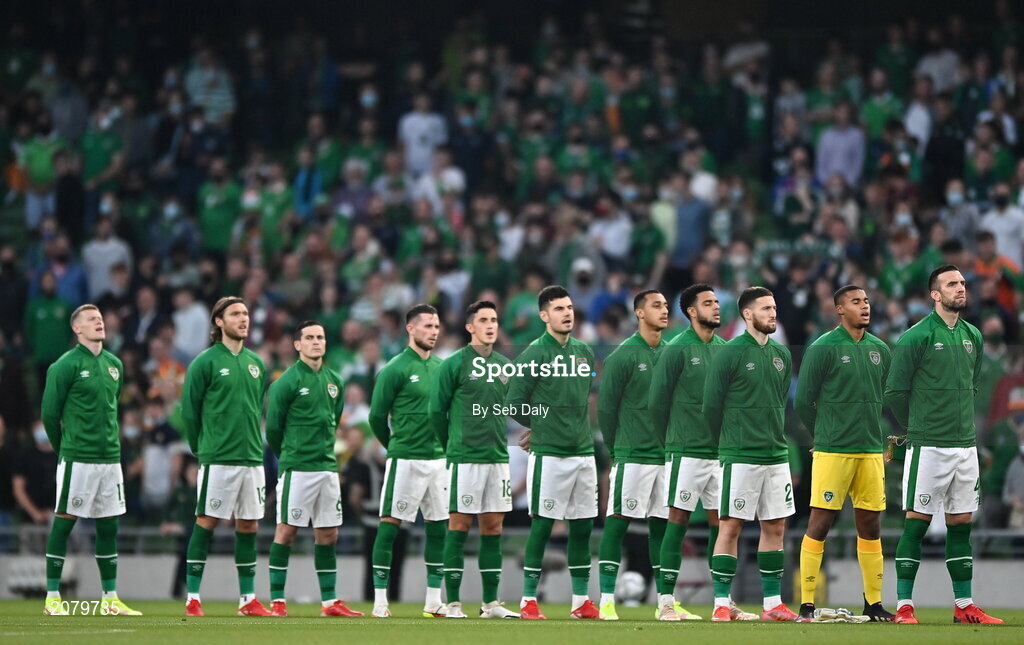 7 September 2021; Republic of Ireland players during Amhrán na bhFiann before the FIFA World Cup 2022 qualifying group A match between Republic of Ireland and Serbia at the Aviva Stadium in Dublin. Photo by Seb Daly/Sportsfile