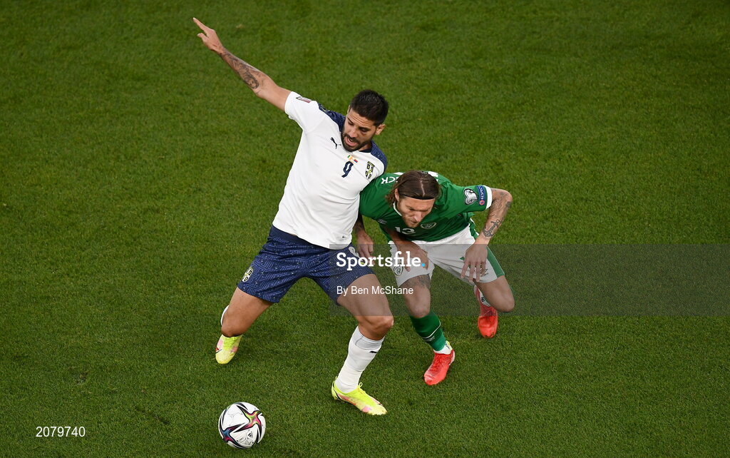 7 September 2021; Aleksandar Mitrovic of Serbia in action against Jeff Hendrick of Republic of Ireland during the FIFA World Cup 2022 qualifying group A match between Republic of Ireland and Serbia at the Aviva Stadium in Dublin. Photo by Ben McShane/Sportsfile