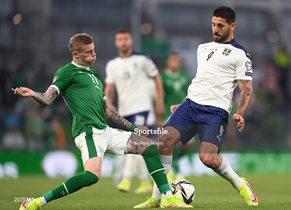 7 September 2021; James McClean of Republic of Ireland in action against Aleksandar Mitrovic of Serbia during the FIFA World Cup 2022 qualifying group A match between Republic of Ireland and Serbia at the Aviva Stadium in Dublin. Photo by Harry Murphy/Sportsfile