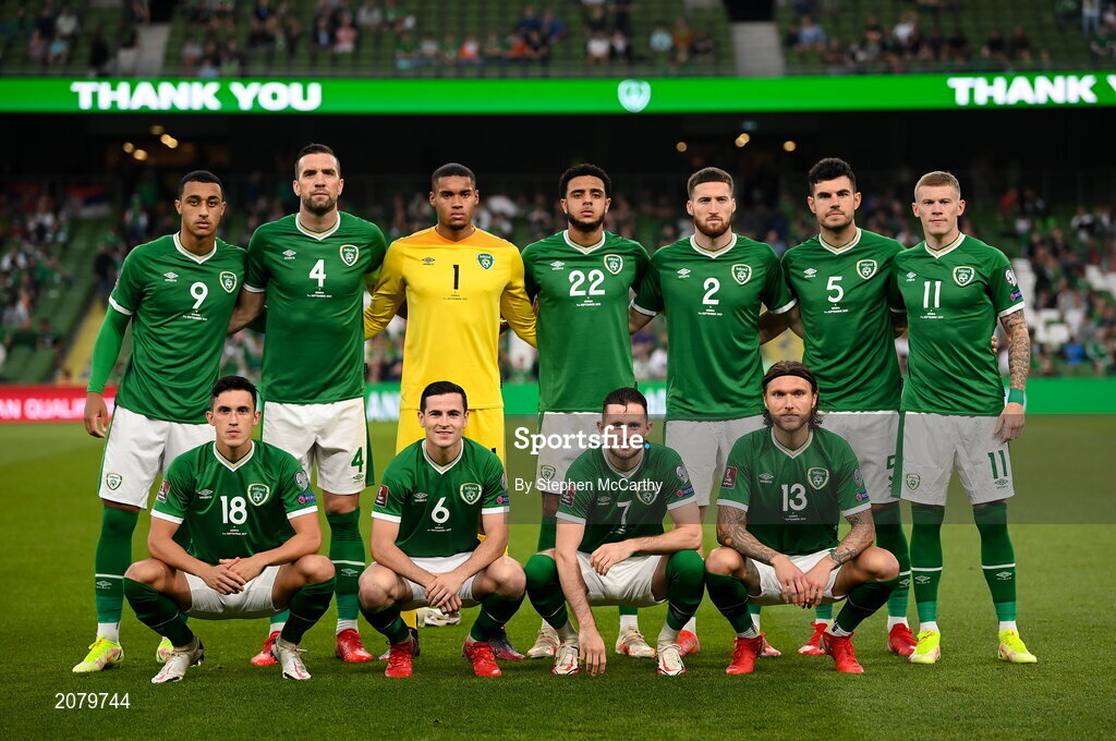 7 September 2021; The Republic of Ireland team, back row, from left, Adam Idah, Shane Duffy, Gavin Bazunu, Andrew Omobamidele, Matt Doherty, John Egan, and James McClean, with, front row, from left, Jamie McGrath, Josh Cullen, Alan Browne and Jeff Hendrick before the FIFA World Cup 2022 qualifying group A match between Republic of Ireland and Serbia at the Aviva Stadium in Dublin. Photo by Stephen McCarthy/Sportsfile