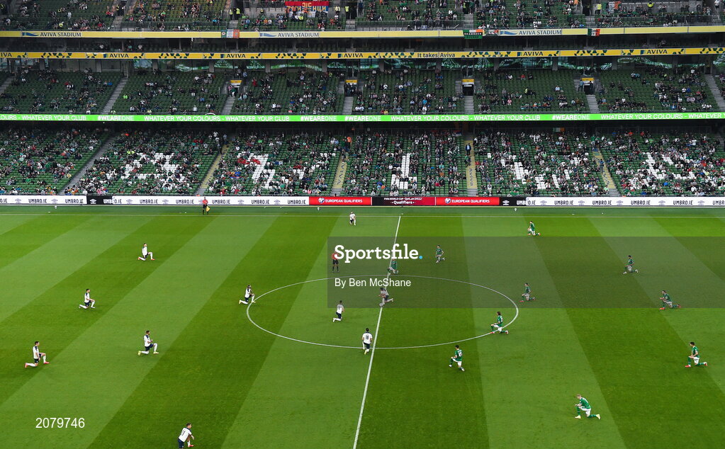 7 September 2021; Republic of Ireland and Serbia take the knee before the FIFA World Cup 2022 qualifying group A match between Republic of Ireland and Serbia at the Aviva Stadium in Dublin. Photo by Ben McShane/Sportsfile