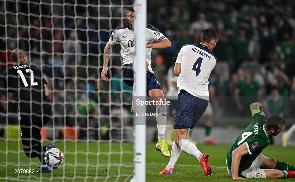 7 September 2021; Nikola Milenkovic of Serbia scores an own goal during the FIFA World Cup 2022 qualifying group A match between Republic of Ireland and Serbia at the Aviva Stadium in Dublin. Photo by Seb Daly/Sportsfile