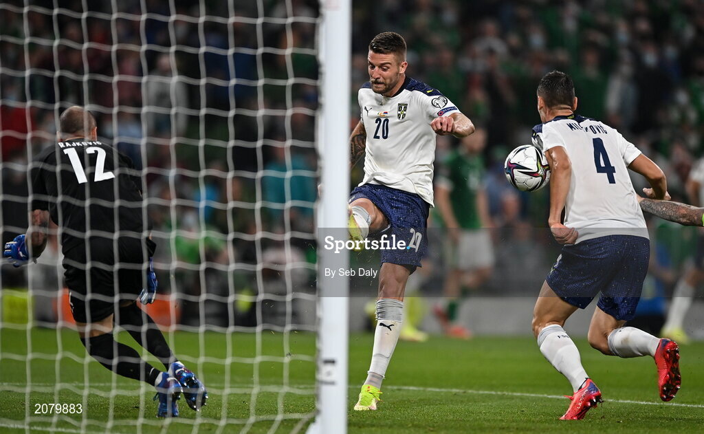 7 September 2021; Nikola Milenkovic of Serbia scores an own goal during the FIFA World Cup 2022 qualifying group A match between Republic of Ireland and Serbia at the Aviva Stadium in Dublin. Photo by Seb Daly/Sportsfile