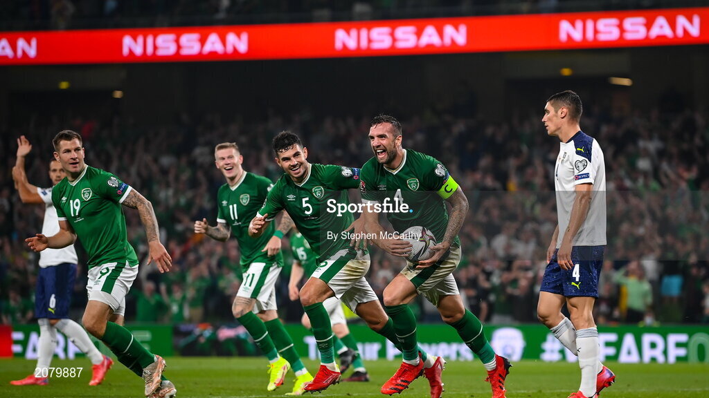 7 September 2021; John Egan and Shane Duffy of Republic of Ireland celebrate after their side's first goal, an own goal scored by Nikola Milenkovic of Serbia, right, during the FIFA World Cup 2022 qualifying group A match between Republic of Ireland and Serbia at the Aviva Stadium in Dublin. Photo by Stephen McCarthy/Sportsfile