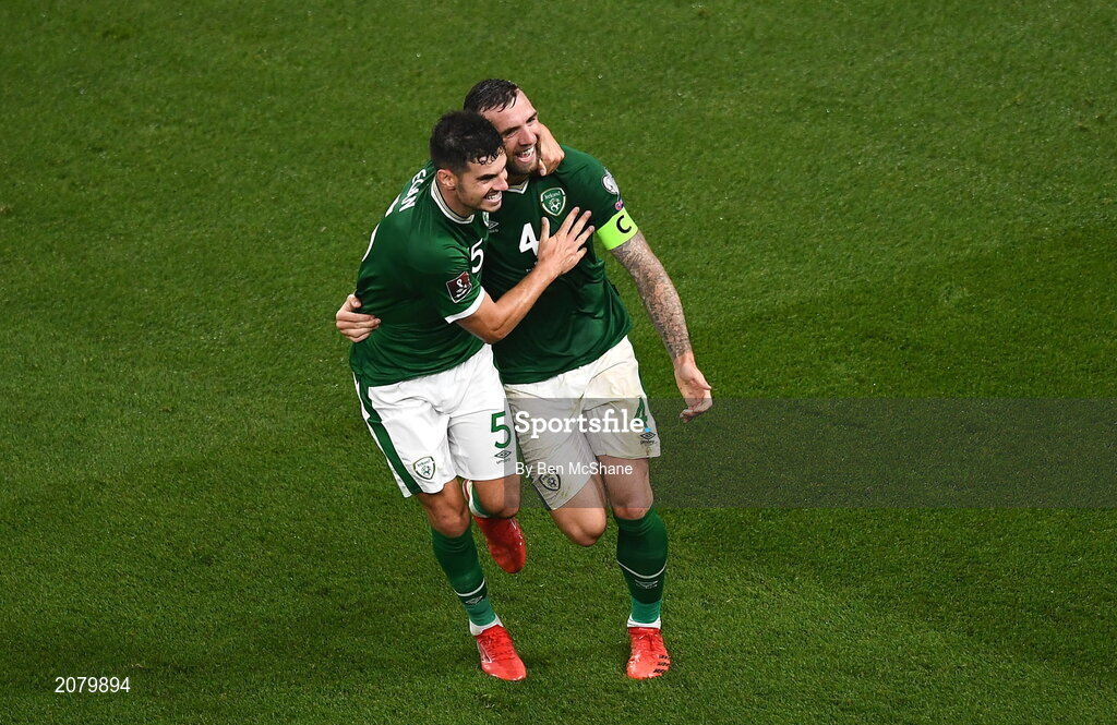 7 September 2021; John Egan and Shane Duffy of Republic of Ireland celebrate after their side's first goal, an own goal scored by Nikola Milenkovic of Serbia, during the FIFA World Cup 2022 qualifying group A match between Republic of Ireland and Serbia at the Aviva Stadium in Dublin. Photo by Ben McShane/Sportsfile