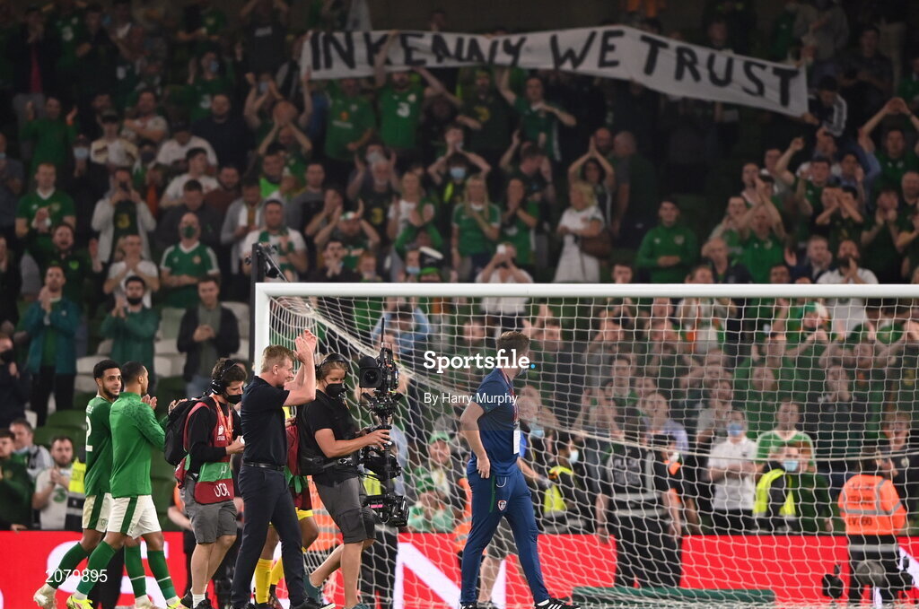 7 September 2021; Republic of Ireland manager Stephen Kenny applauds supporters after the FIFA World Cup 2022 qualifying group A match between Republic of Ireland and Serbia at the Aviva Stadium in Dublin. Photo by Harry Murphy/Sportsfile