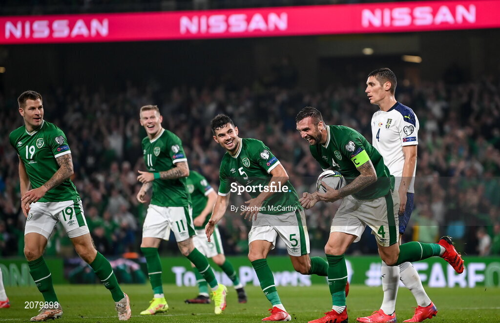 7 September 2021; Republic of Ireland players, from left, James Collins, James McClean, John Egan and Shane Duffy celebrate after their side's first goal, an own goal scored by Nikola Milenkovic of Serbia, right, during the FIFA World Cup 2022 qualifying group A match between Republic of Ireland and Serbia at the Aviva Stadium in Dublin. Photo by Stephen McCarthy/Sportsfile
