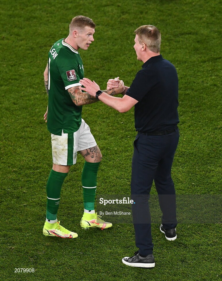 7 September 2021; James McClean of Republic of Ireland with manager Stephen Kenny after the FIFA World Cup 2022 qualifying group A match between Republic of Ireland and Serbia at the Aviva Stadium in Dublin. Photo by Ben McShane/Sportsfile