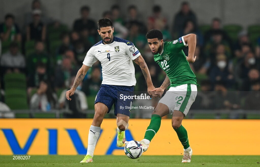 7 September 2021; Andrew Omobamidele of Republic of Ireland in action against Aleksandar Mitrovic of Serbia during the FIFA World Cup 2022 qualifying group A match between Republic of Ireland and Serbia at the Aviva Stadium in Dublin. Photo by Stephen McCarthy/Sportsfile
