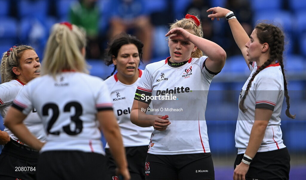 4 September 2021; India Daley of Ulster, second from right, reacts after her side conceded a try during the IRFU Women's Interprovincial Championship Round 2 match between Leinster and Ulster at Energia Park in Dublin. Photo by Piaras Ó Mídheach/Sportsfile