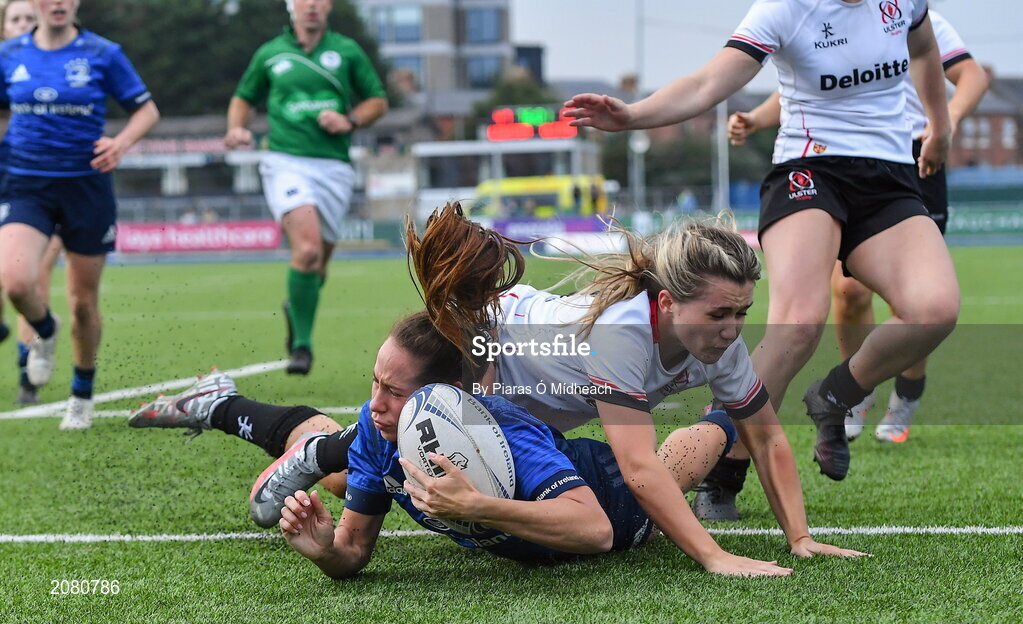 4 September 2021; Emily McKeown of Leinster scores a try, despite the efforts of Rachael McIlroy of Ulster, during the IRFU Women's Interprovincial Championship Round 2 match between Leinster and Ulster at Energia Park in Dublin. Photo by Piaras Ó Mídheach/Sportsfile
