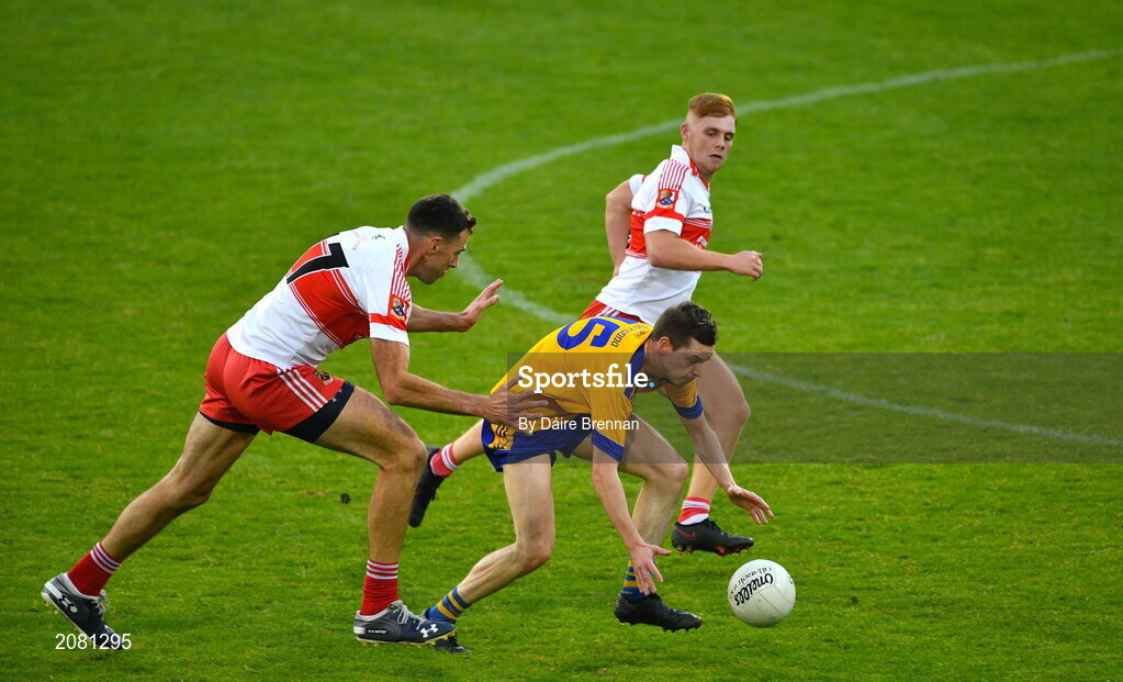 10 September 2021; David Quinn of Na Fianna in action against Eddie Moran, left, and Seán Giles of Whitehall Colmcille during the Go Ahead Dublin Senior Club Football Championship Group 1 match between Na Fianna and Whitehall Colmcille at Parnell Park in Dublin. Photo by Daire Brennan/Sportsfile