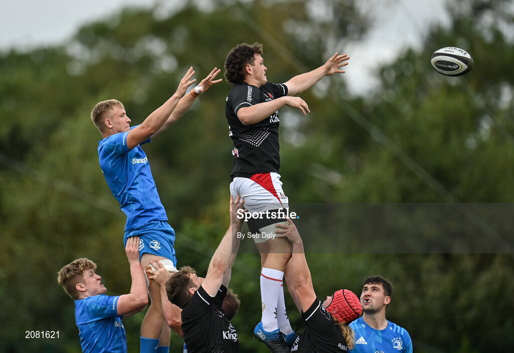 11 September 2021; Lorcan McLoughlin of Ulster takes possession in a line-out ahead of Fionn McWey of Leinster during the Development Interprovincial match between Leinster XV and Ulster XV at the IRFU High Performance Centre, on the Sport Ireland Campus in Dublin. Photo by Seb Daly/Sportsfile