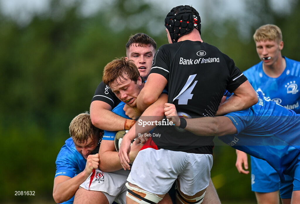 11 September 2021; Donough Lawlor of Leinster is tackled by James McCormick, left, and Charlie Irvine of Ulster during the Development Interprovincial match between Leinster XV and Ulster XV at the IRFU High Performance Centre, on the Sport Ireland Campus in Dublin. Photo by Seb Daly/Sportsfile