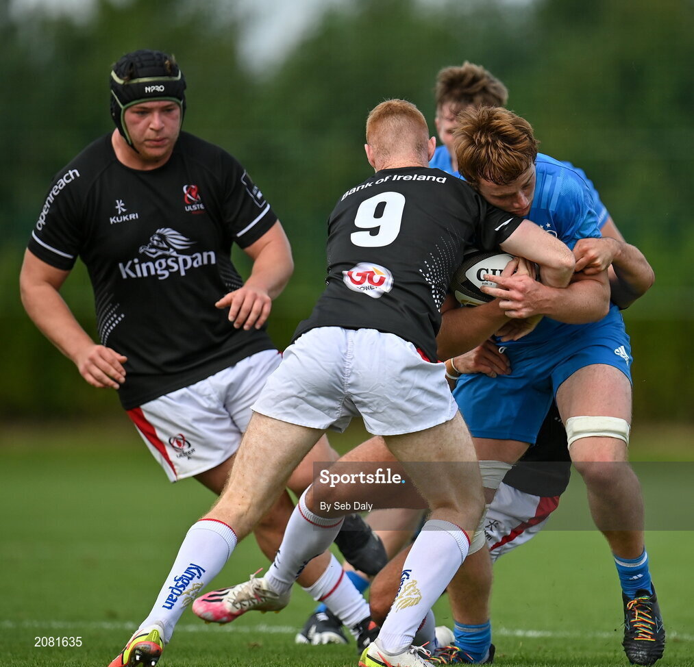 11 September 2021; Donough Lawlor of Leinster is tackled by Nathan Doak of Ulster during the Development Interprovincial match between Leinster XV and Ulster XV at the IRFU High Performance Centre, on the Sport Ireland Campus in Dublin. Photo by Seb Daly/Sportsfile