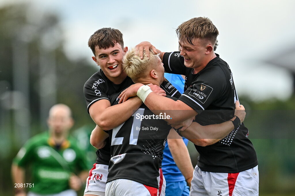 11 September 2021; Lewis Finlay of Ulster, centre, is congratulated by team-mates Ross Taylor, left, and Josh Hanlon after scoring a try during the Development Interprovincial match between Leinster XV and Ulster XV at the IRFU High Performance Centre, on the Sport Ireland Campus in Dublin. Photo by Seb Daly/Sportsfile