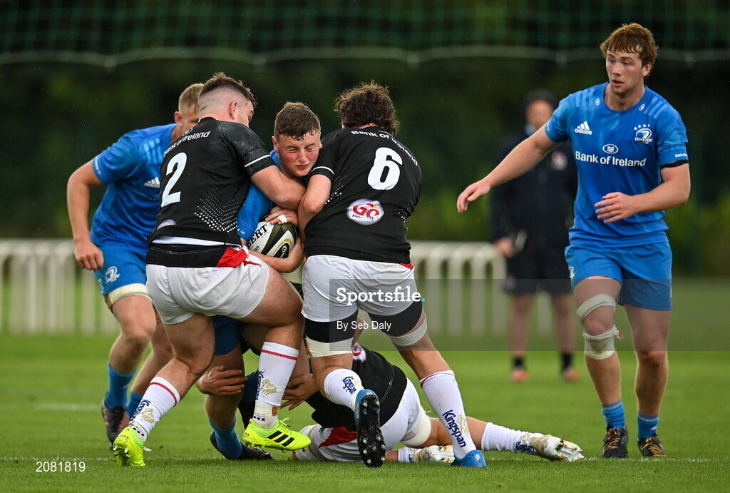 11 September 2021; Fionn Gibbons of Leinster is tackled by James McCormick, left, and Lorcan McLoughlin of Ulster during the Development Interprovincial match between Leinster XV and Ulster XV at the IRFU High Performance Centre, on the Sport Ireland Campus in Dublin. Photo by Seb Daly/Sportsfile