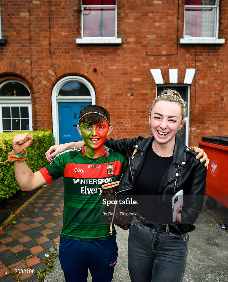 11 September 2021; Paralympic swimmer Ellen Keane jumps in for a photo with Mayo supporter Donnacha Togher, from Belmullet, Mayo prior to the GAA Football All-Ireland Senior Championship Final match between Mayo and Tyrone at Croke Park in Dublin. Photo by David Fitzgerald/Sportsfile