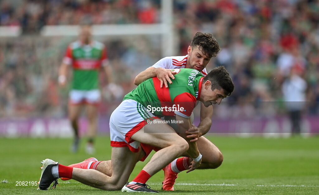 11 September 2021; Conor Loftus of Mayo is tackled by Conor McKenna of Tyrone during the GAA Football All-Ireland Senior Championship Final match between Mayo and Tyrone at Croke Park in Dublin. Photo by Brendan Moran/Sportsfile