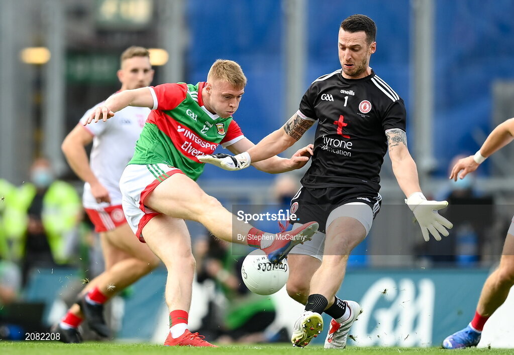 11 September 2021; Bryan Walsh of Mayo has his shot on goal blocked by Tyrone goalkeeper Niall Morgan during the GAA Football All-Ireland Senior Championship Final match between Mayo and Tyrone at Croke Park in Dublin. Photo by Stephen McCarthy/Sportsfile