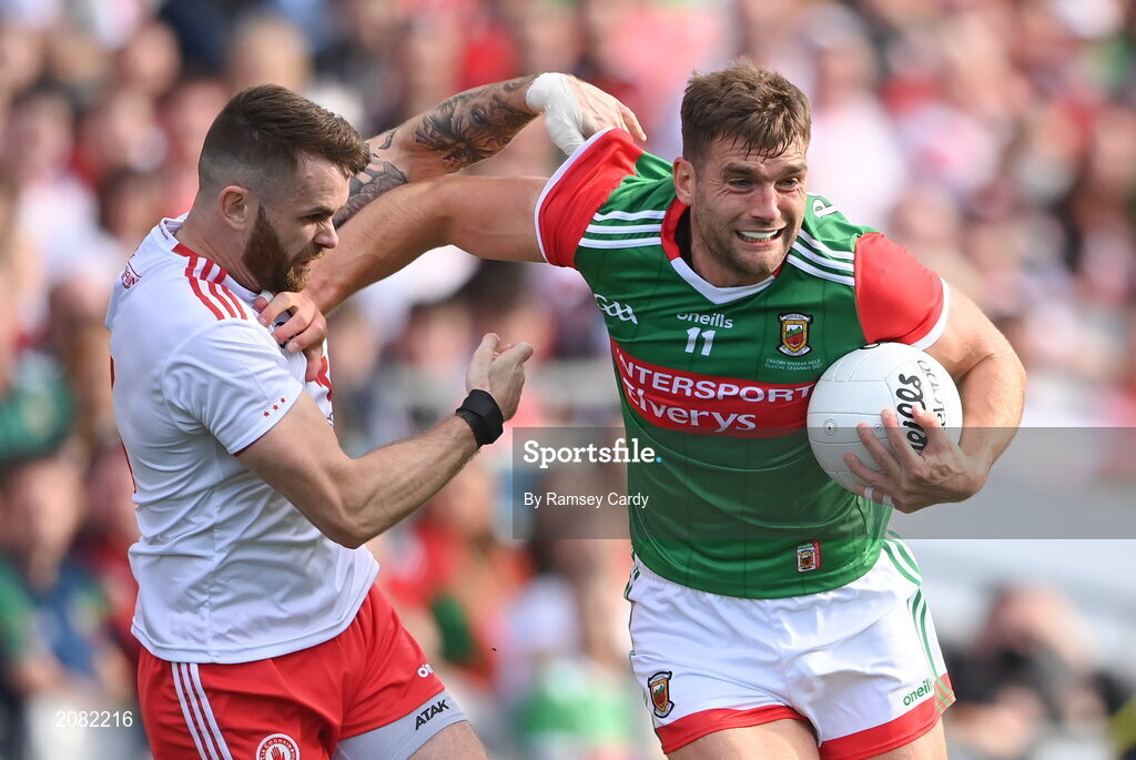 11 September 2021; Aidan O'Shea of Mayo in action against Ronan McNamee of Tyrone during the GAA Football All-Ireland Senior Championship Final match between Mayo and Tyrone at Croke Park in Dublin. Photo by Ramsey Cardy/Sportsfile