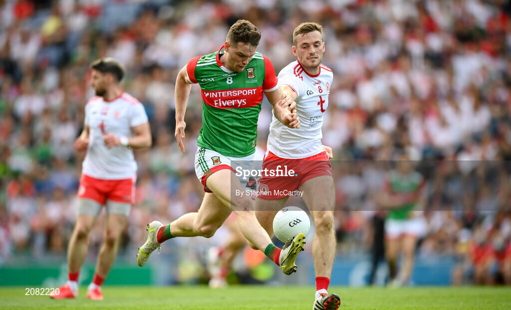 11 September 2021; Matthew Ruane of Mayo in action against Brian Kennedy of Tyrone during the GAA Football All-Ireland Senior Championship Final match between Mayo and Tyrone at Croke Park in Dublin. Photo by Stephen McCarthy/Sportsfile