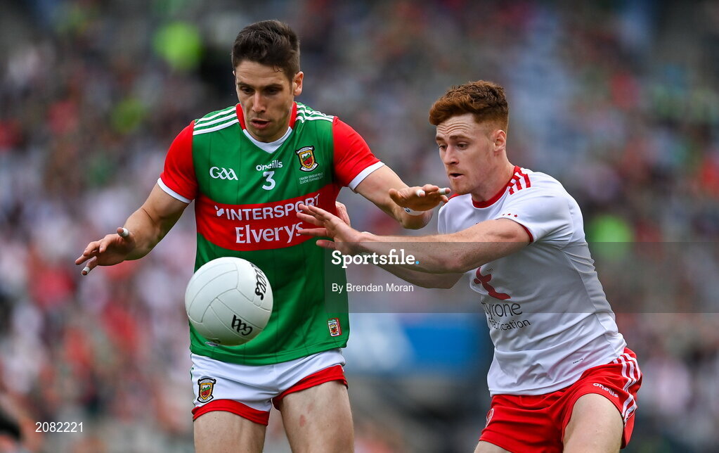 11 September 2021; Lee Keegan of Mayo in action against Conor Meyler of Tyrone during the GAA Football All-Ireland Senior Championship Final match between Mayo and Tyrone at Croke Park in Dublin. Photo by Brendan Moran/Sportsfile