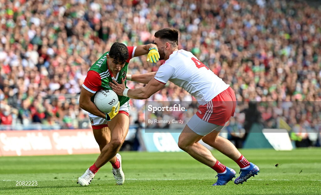11 September 2021; Tommy Conroy of Mayo in action against Pádraig Hampsey during the GAA Football All-Ireland Senior Championship Final match between Mayo and Tyrone at Croke Park in Dublin. Photo by Ramsey Cardy/Sportsfile
