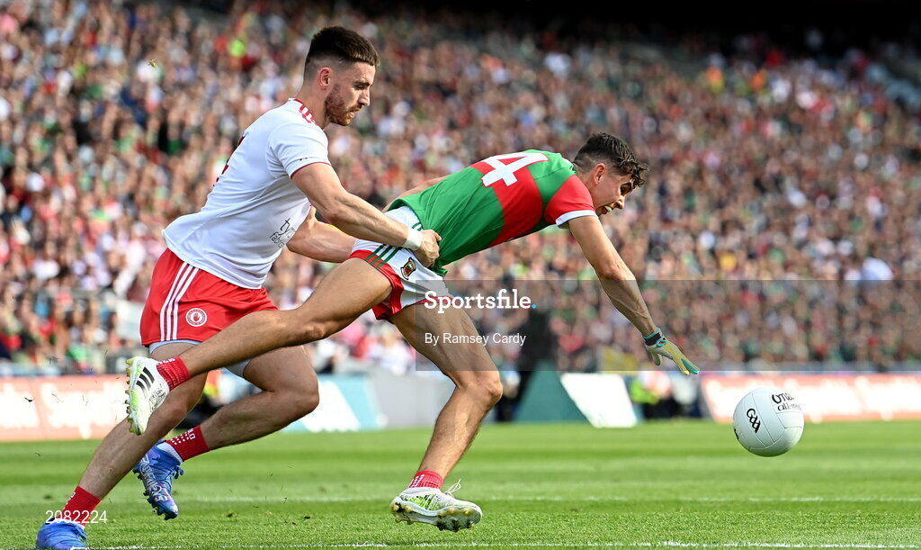 11 September 2021; Tommy Conroy of Mayo in action against Pádraig Hampsey during the GAA Football All-Ireland Senior Championship Final match between Mayo and Tyrone at Croke Park in Dublin. Photo by Ramsey Cardy/Sportsfile